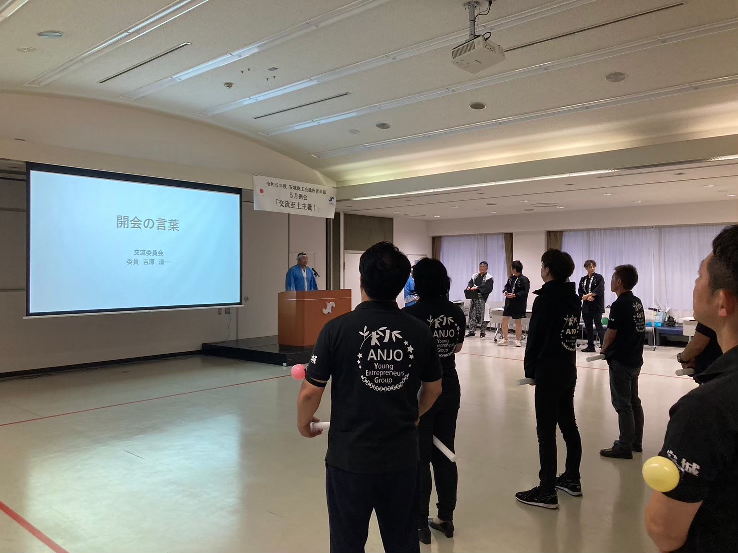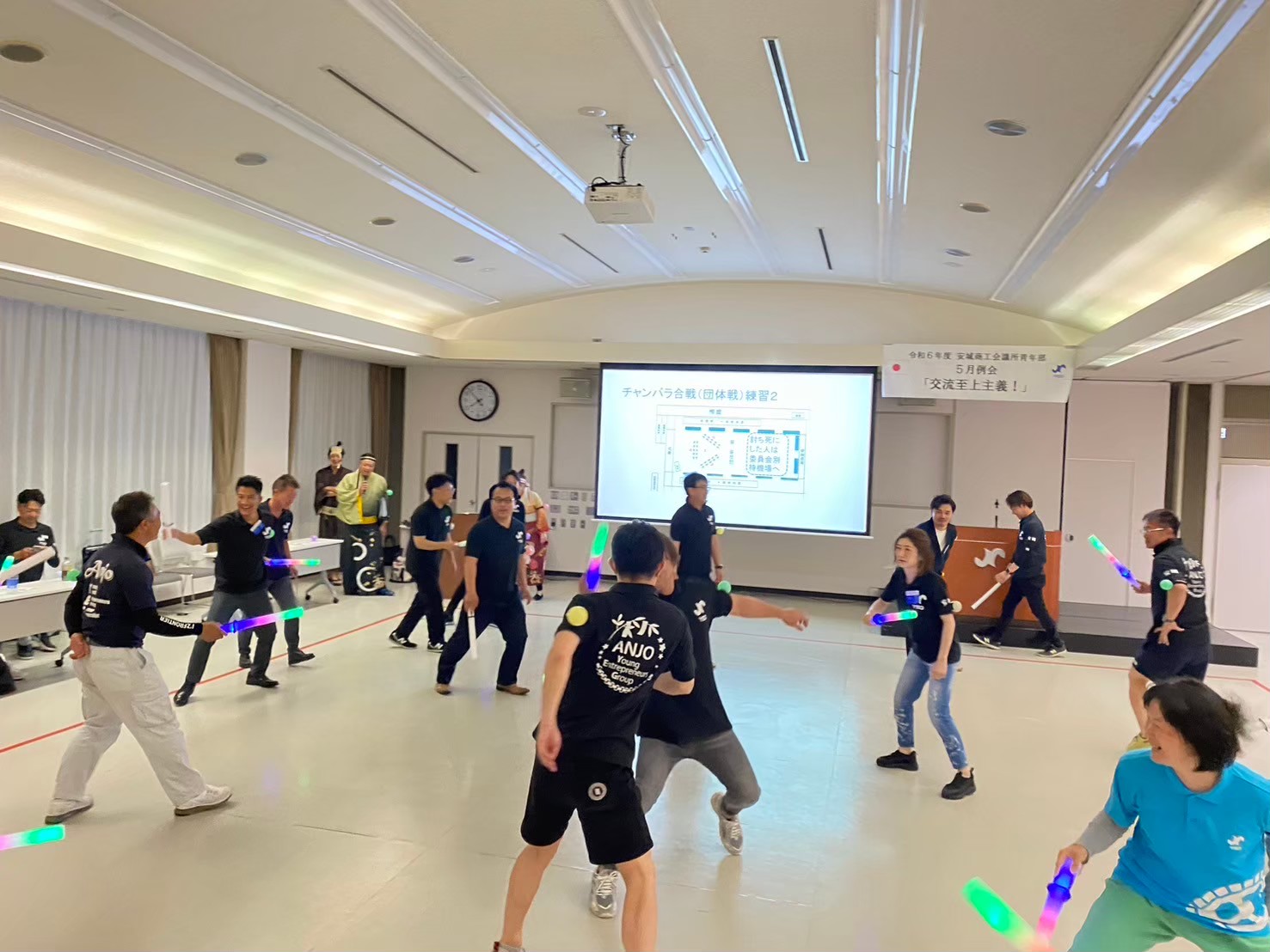 令和6年5月23日に、5月例会「交流至上主義!」を開催しました。安城商工会議所の5階大会議室にて、委員会対抗のチャンバラ合戦を行いました。チャンバラ合戦というと子どもの遊びをイメージしますが、実際に始まると大人たちは必死に刀を振り回し、熱い戦いが繰り広げられました。個人戦と団体戦を行いましたが、どの試合も白熱したバトルとなりました。思うように体が動かず苦戦している方や、普段は大人しそうなのに戦いの場では積極的になる方、優しく守ってくれる方など、青年部活動では見られない姿を見ることができ、非常に貴重な体験でした。今月のタイトル「交流至上主義!」には、普段は委員会内でしか交流できていない青年部員同士が、例会を通じてより多く交流し、交友関係を広げたり、社業の発展に繋げてほしいという交流委員会の想いが込められています。一つの例会のためにPR動画を制作したり、三重まで写真を撮りに行ったりと、熱意のある交流委員会の取り組みが青年部員に伝わり、多くの参加者で例会を盛り上げることができました。